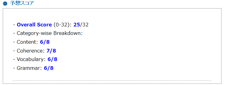 予想スコアはContent、Coherence、Vovabulary、Grammarの4つのカテゴリで獲得可能な点数を表示します。英検1級は32点満点、準1級は16点満点で採点します。