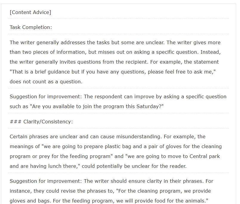 ※ 以下は、TOEIC Writing Part5,6 Eメール問題Respond to a Written RequestのContent Advice表示サンプルです。